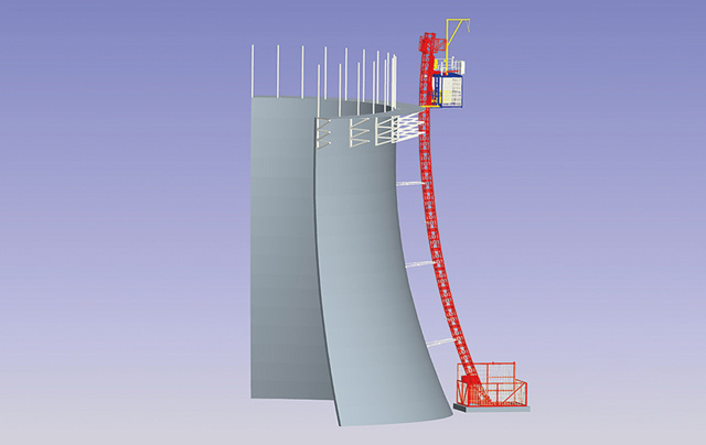 該機是冷卻塔施工的專用設備,與升降機配合使用,頂部塔機可以吊運鋼筋,塔身為升降機提供附著支撐,水平吊橋為施工人員和物料提供平臺。